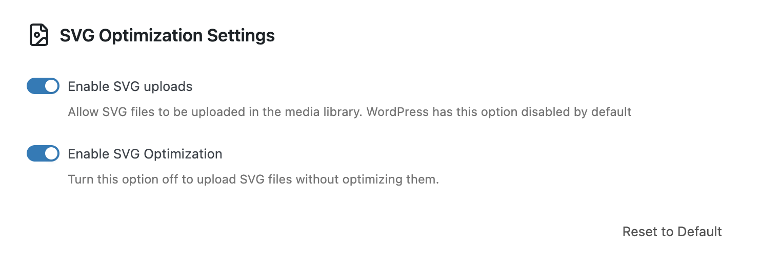 - Enable SVG Uploads: Activating this setting allows you to upload SVG files directly into your WordPress Media Library just like JPEGs or PNGs.