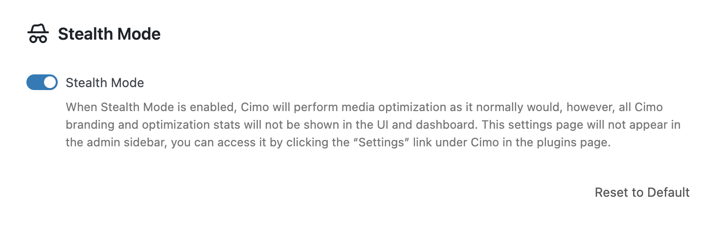 Hide all Cimo branding and optimization stats. Cimo will not be visible, however, all optimization functions continue normally.