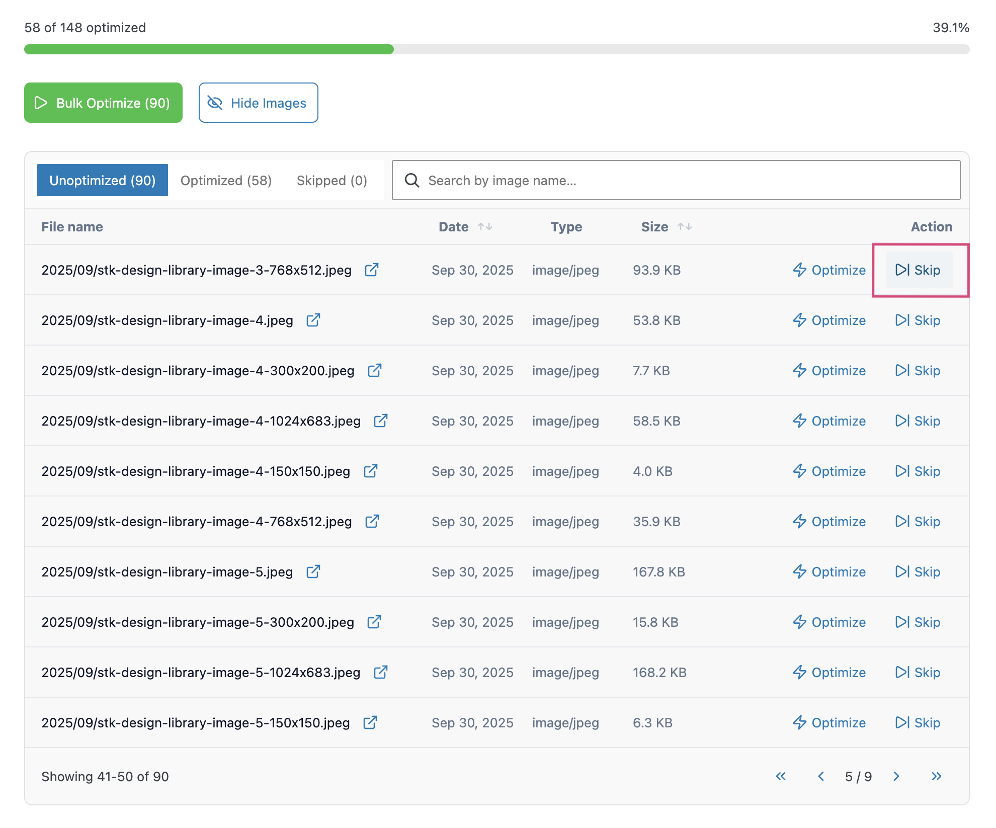 - Skip β Excludes the image from being optimized. The image will be moved to the Skipped tab and will not be included in future bulk optimization runs unless unskipped.